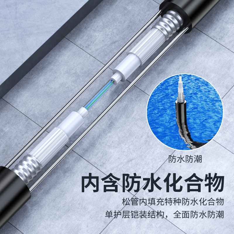 采用環(huán)保聚乙烯 (HDPE)黑色外被,添加UV防曬材料,耐高低溫,不易老化。高品質(zhì)線芯不易斷損耗低,采用高品質(zhì)纖芯, 損耗低穩(wěn)定抗干擾, 傳輸更快。足芯足米應(yīng)用廣泛,滿足不同環(huán)境的工作需求。強悍拉伸力和壓扁力,采用鋼塑復(fù)合帶鎧裝護(hù)套, 加粗磷化鋼絲具有良好的抗拉, 抗壓性。