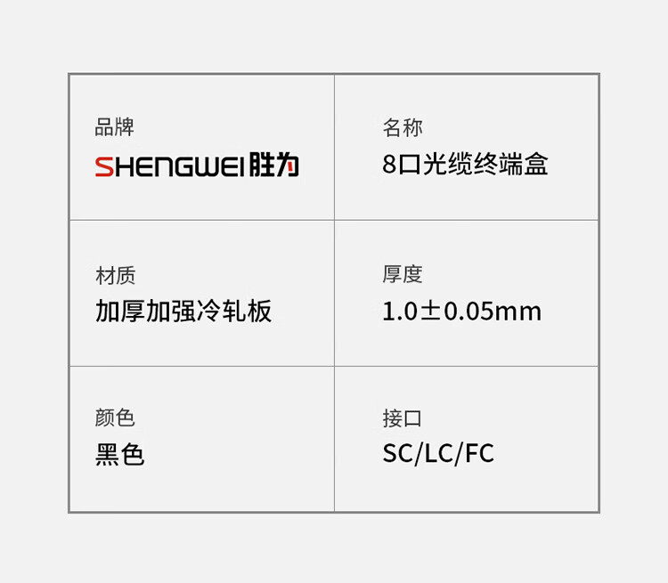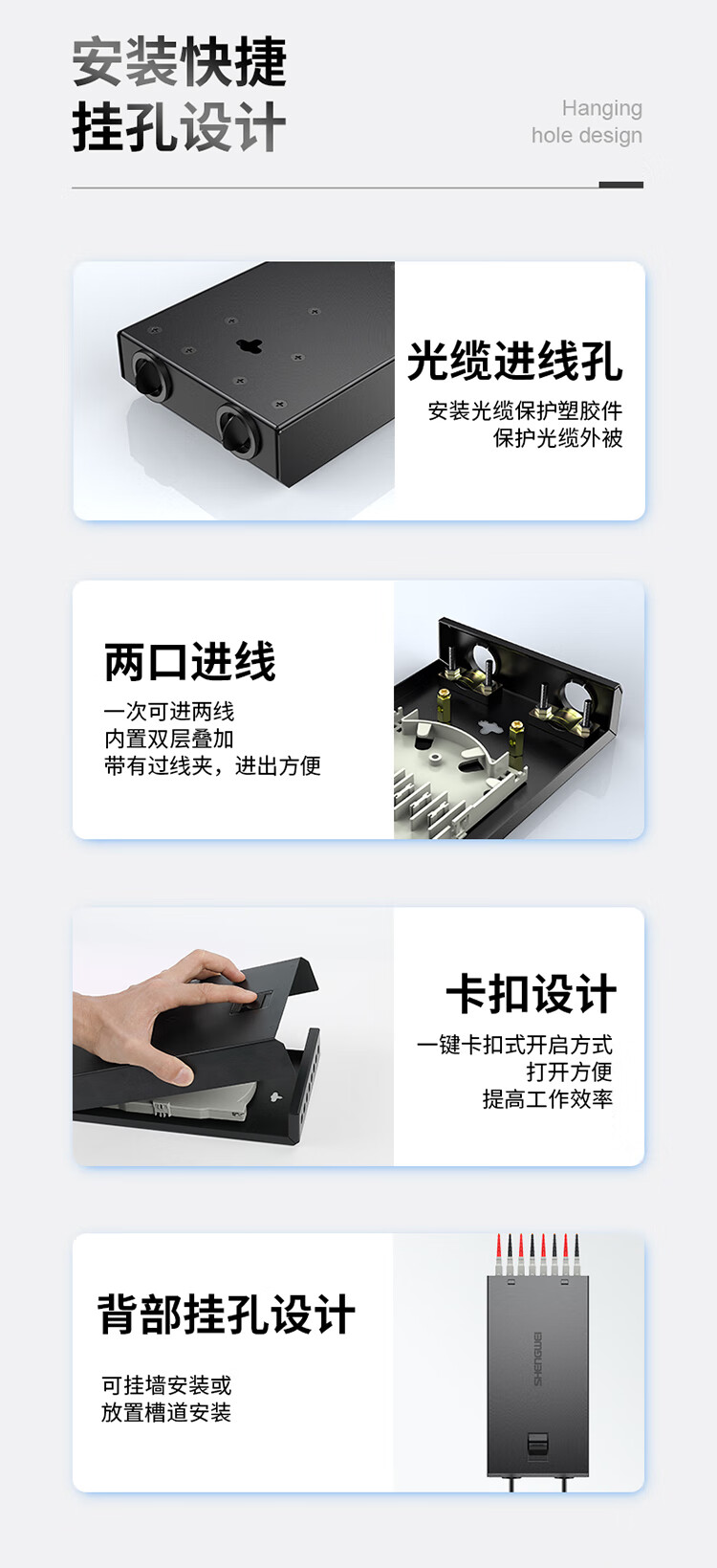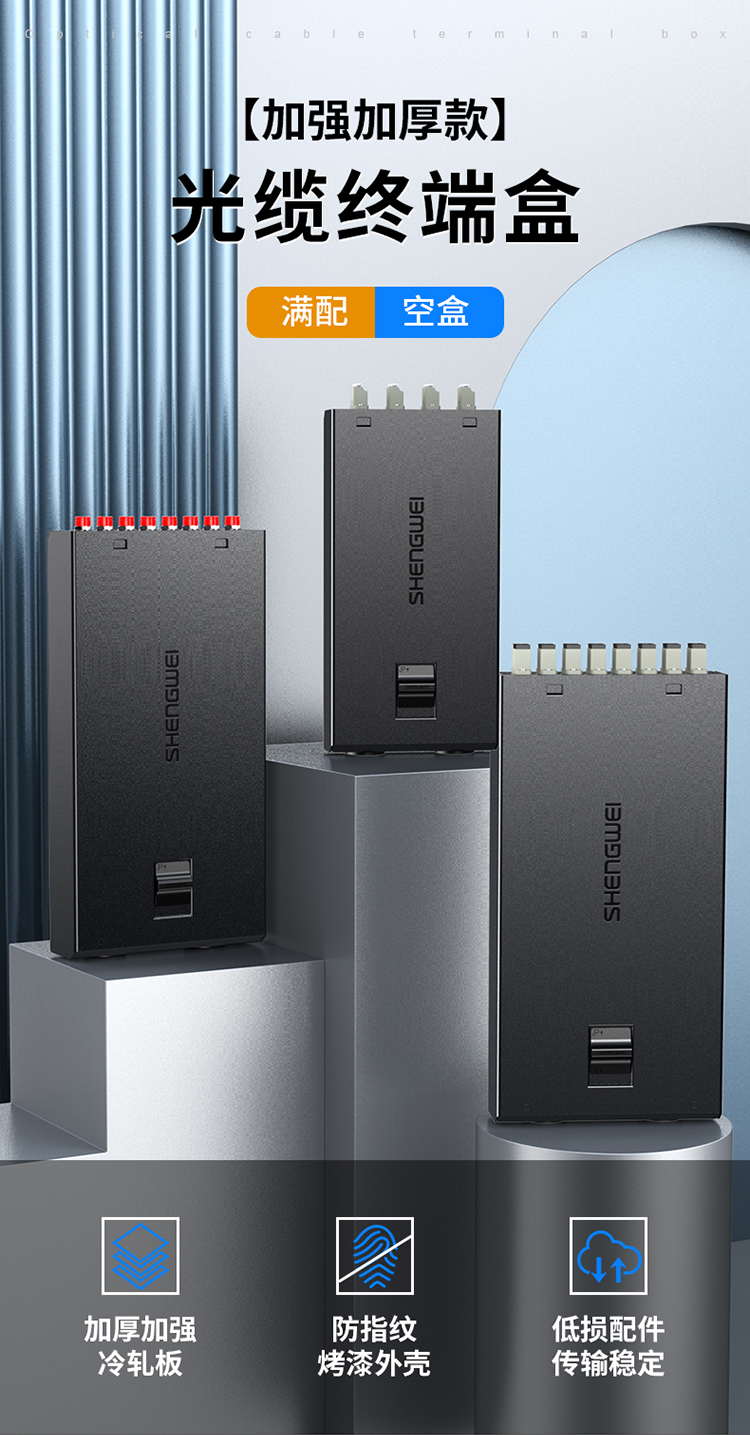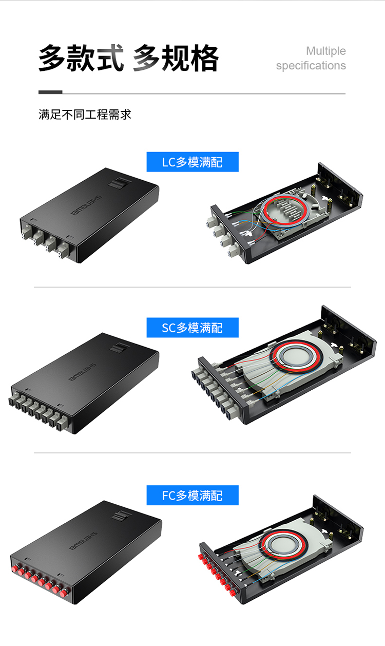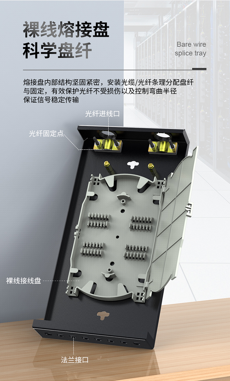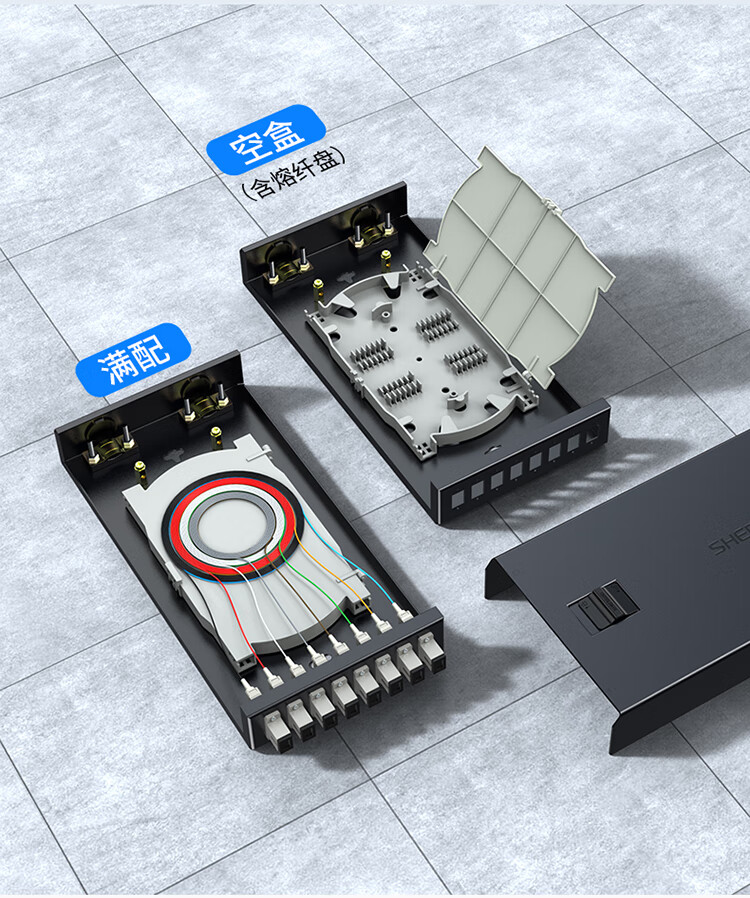 加厚加強冷軋板材質, 抗壓耐沖擊持久使用不變形, 承重力強。采用黑色環氧靜電噴塑烤漆工藝, 高度耐磨耐腐蝕不沾指紋, 質感好。采用低損配件, 減少信號傳輸損耗;卡扣和螺絲采用內凹設計, 堆疊平穩, 節省空間;安裝快捷,掛孔設計;熔接盤內部結構堅固緊密, 安裝光纜/光纖條理分配盤纖與固定, 有效保護光纖不受損傷以及控制彎曲半徑保證信號穩定傳輸。