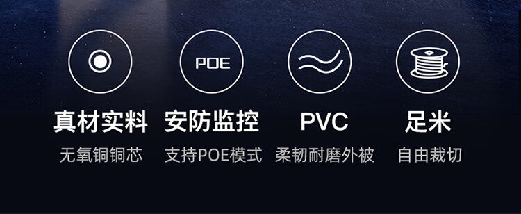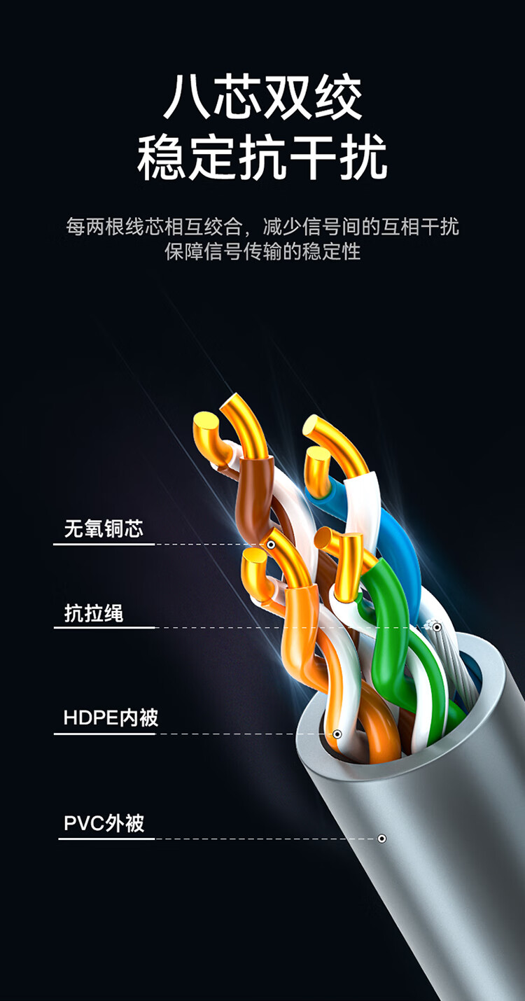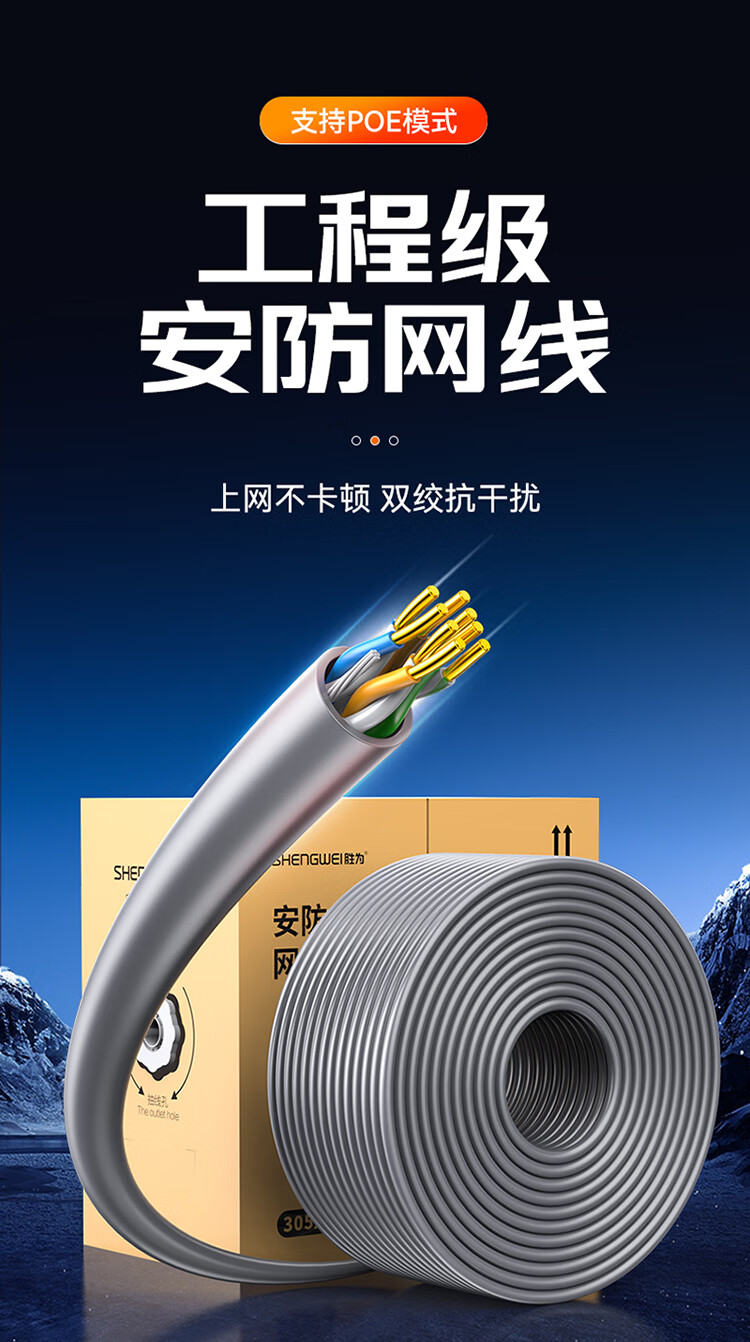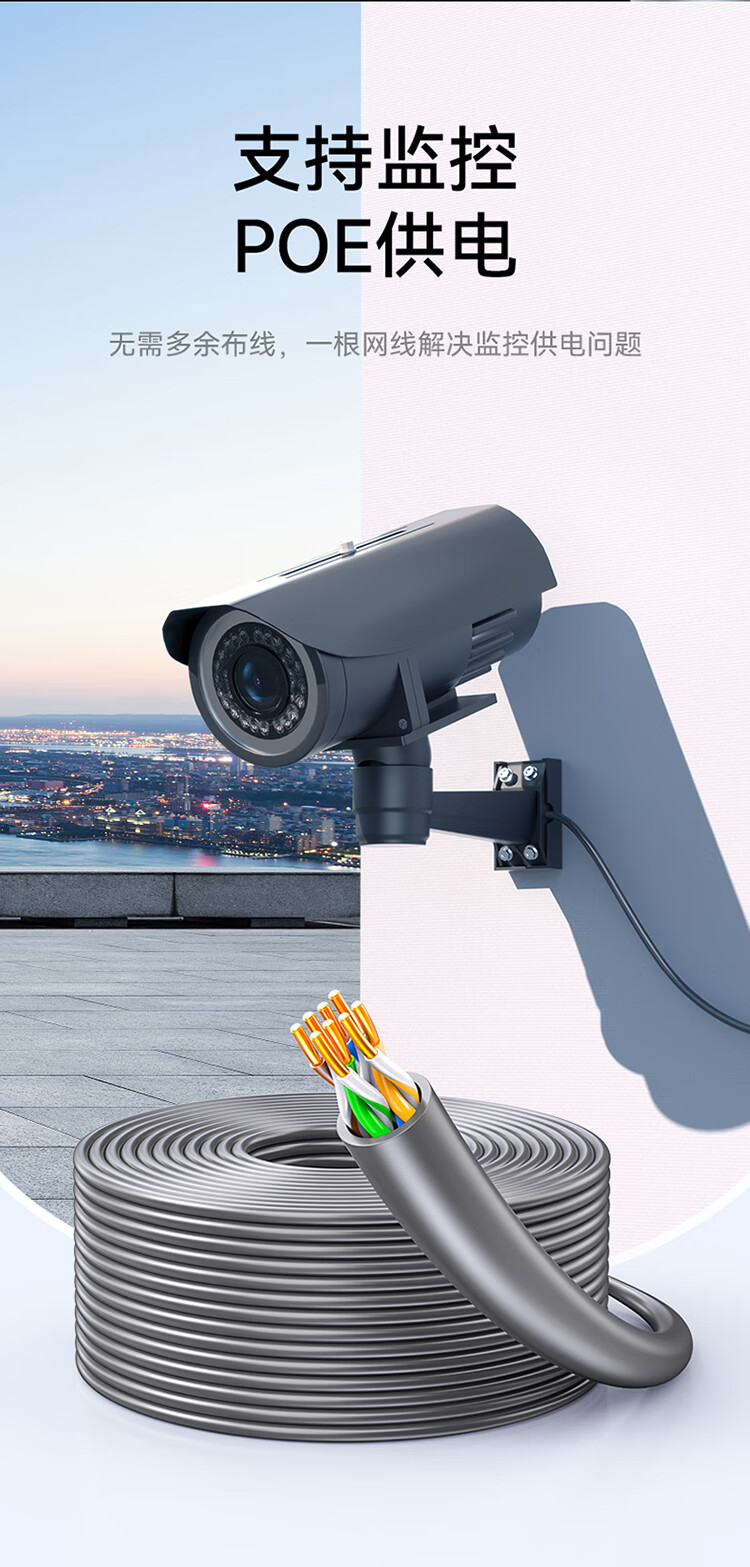 智能主動放線,芯線押出采用主動放線技術,保障銅線直徑的一致性,從而更好控制導體電阻的一致性,使信號傳輸更均勻穩定;無氧銅芯,嚴選25AWG標準無氧銅芯,傳輸阻抗低;采用PVC環保外被,柔韌抗老化;八芯雙絞,穩定抗干擾,每兩根線芯相互絞合,減少信號間的互相干擾,保障信號傳輸的穩定性,支持監控,POE供電,無需多余布線,一根網線解決監控供電問題。