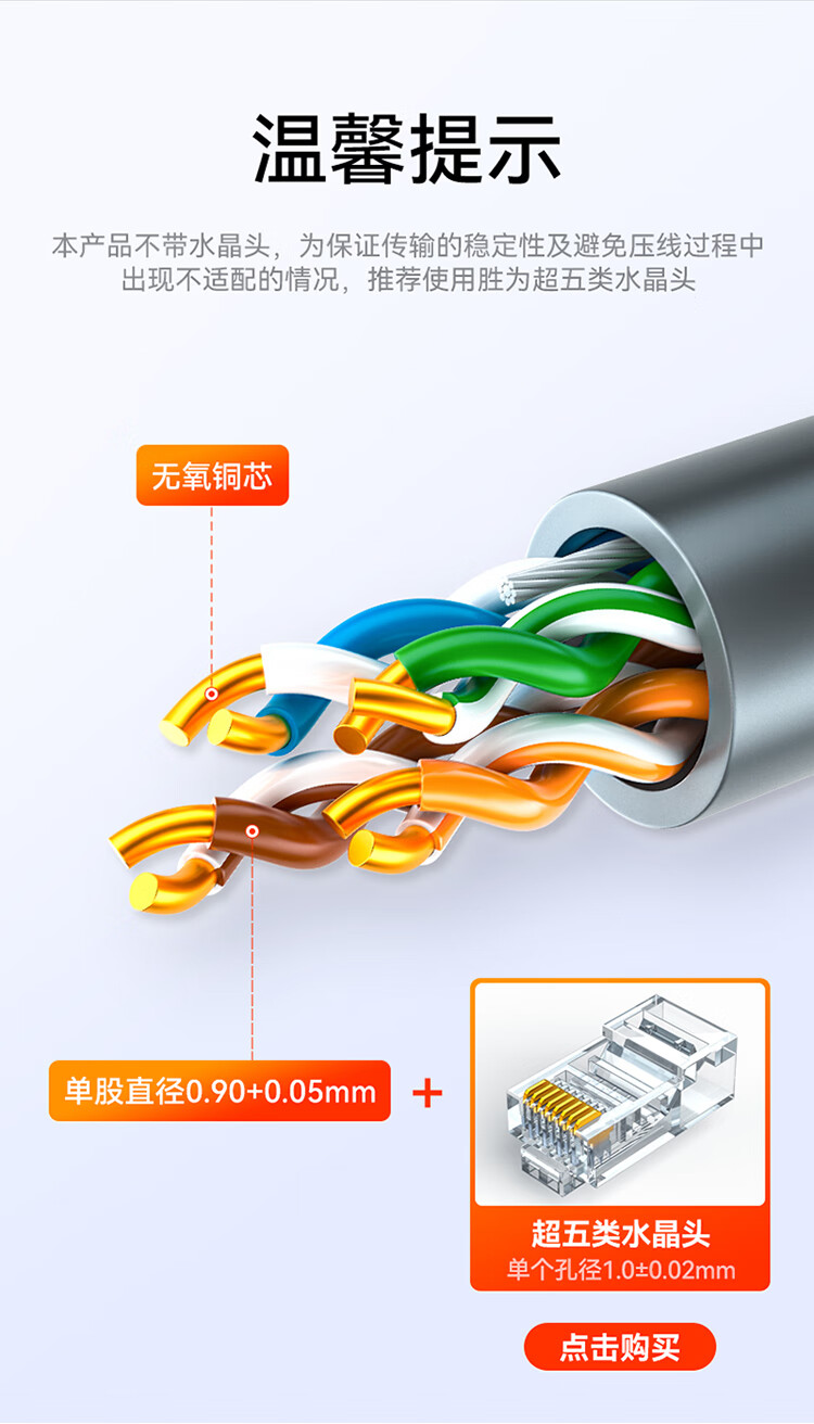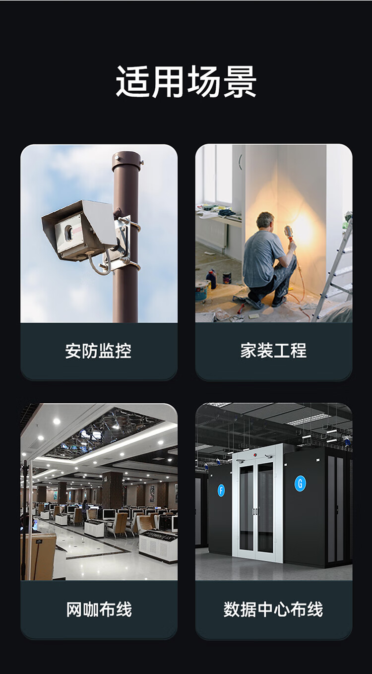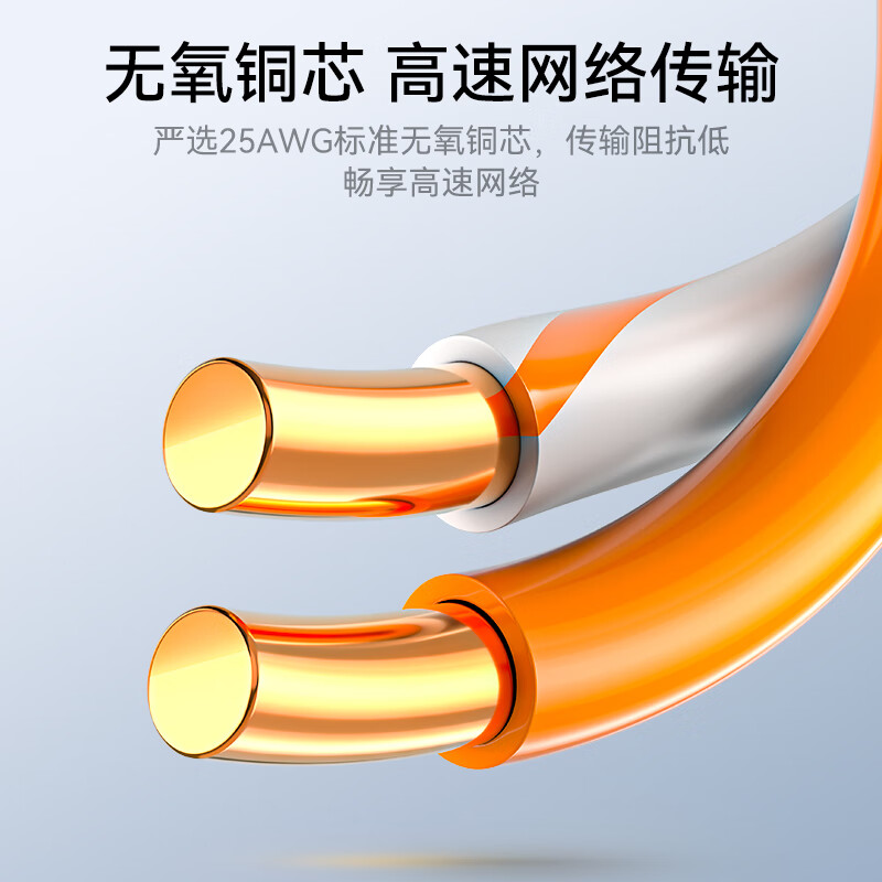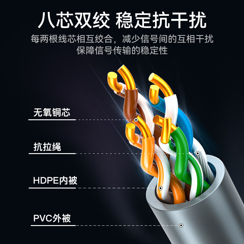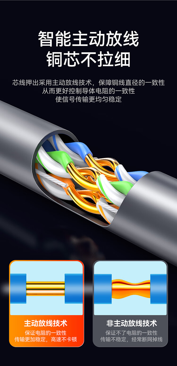 智能主動放線,芯線押出采用主動放線技術,保障銅線直徑的一致性,從而更好控制導體電阻的一致性,使信號傳輸更均勻穩定;無氧銅芯,嚴選25AWG標準無氧銅芯,傳輸阻抗低;采用PVC環保外被,柔韌抗老化;八芯雙絞,穩定抗干擾,每兩根線芯相互絞合,減少信號間的互相干擾,保障信號傳輸的穩定性,支持監控,POE供電,無需多余布線,一根網線解決監控供電問題。