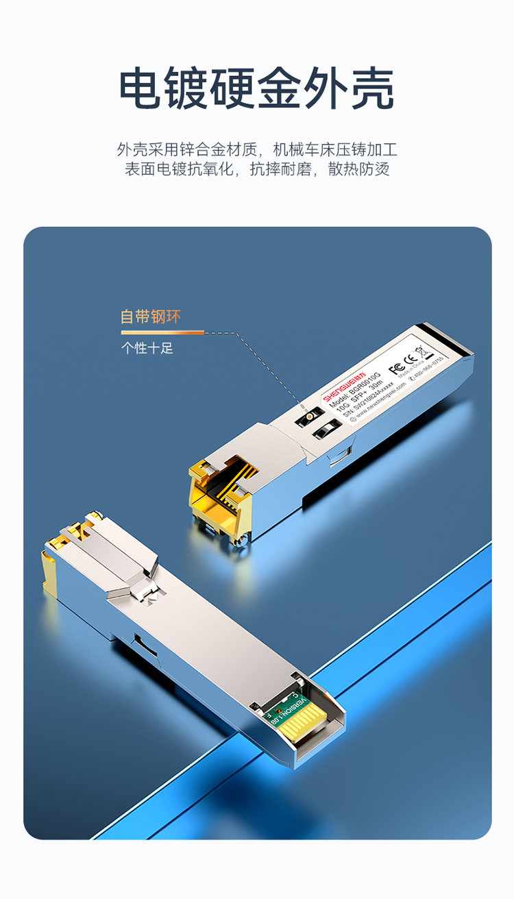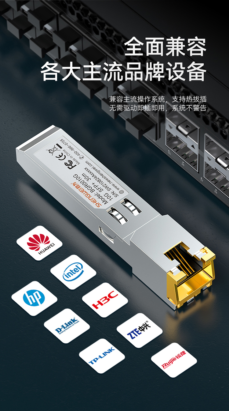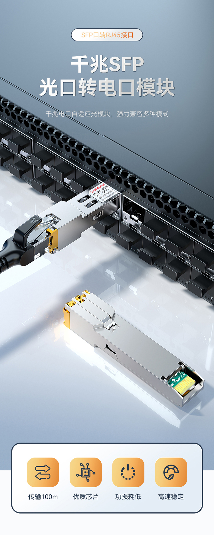 適用于帶SFP光口的交換機、服務器,防火墻、收發器等光纖通訊設備。支持熱插拔,RJ45接口直連網線,簡單快速連接設備,系統不告警。