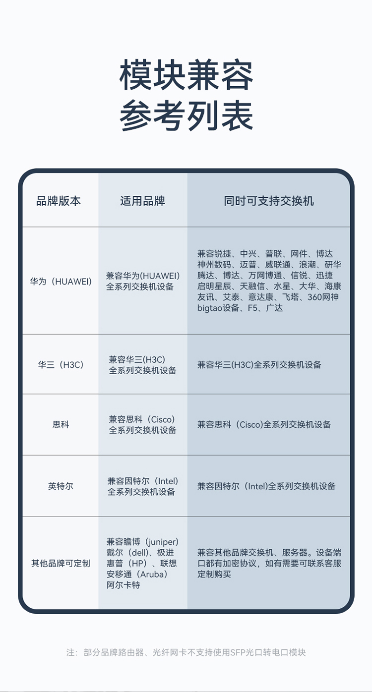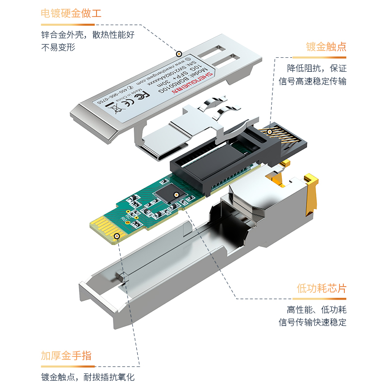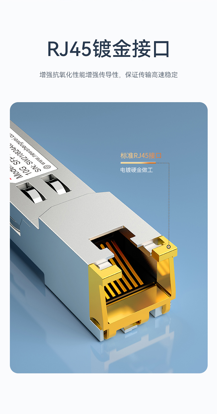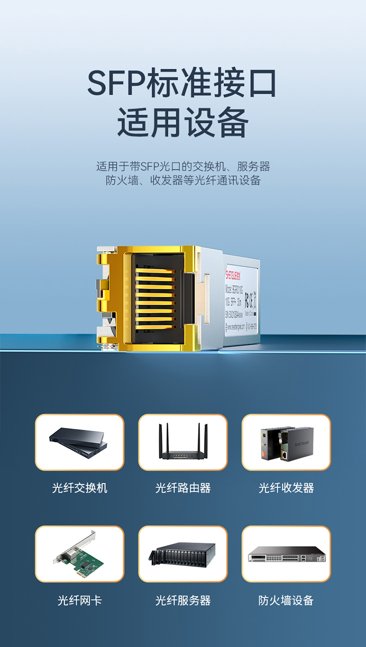 適用于帶SFP光口的交換機、服務器,防火墻、收發器等光纖通訊設備。支持熱插拔,RJ45接口直連網線,簡單快速連接設備,系統不告警。
